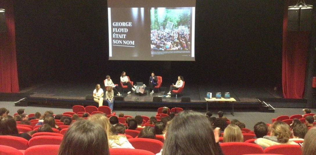 La rencontre avait été organisée par les professeures documentalistes, Cécile Mourier et Xavière Groyer. « Une parent d'élève, qui venait faire dédicacer son livre, a suggéré à Mme Le Blé d'intervenir au lycée, raconte Mme Mourier. « On a eu un magnifique contact et, de fil en aiguille, le rendez-vous a été pris aujourd'hui [n.d.l.r. : vendredi 14 avril]. » Plus qu'un rendez-vous, c'est un véritable échange qui a eu lieu dans l'amphithéâtre devant les élèves de première en spécialité HLP et de terminale en spé HGGSP. Sur la scène, Mme Le Blé était entourée de trois élèves de terminale : Ambre, Margaux et Nathanaël, tous trois en terminale HGGSP. En parallèle, Apolline et moi-même passions dans les rangs afin de permettre aux élèves d'intervenir et, ainsi, de nouer une vraie discussion. La discussion portait principalement sur le livre de Mme Le Blé, un ouvrage qui raconte la vie de la journaliste à New York durant l'année 2020, les rues vides, les gens masqués qui désinfectent le métro le forçant, pour la première fois, à déroger à la règle du fonctionnement ininterrompu. La mort de Georg Floyd, qui « met le feu aux poudres », le président Trump, en pleine campagne présidentielle, qui « fait son show », la montée du crime avant le retour à la normale étaient également évoqués.
