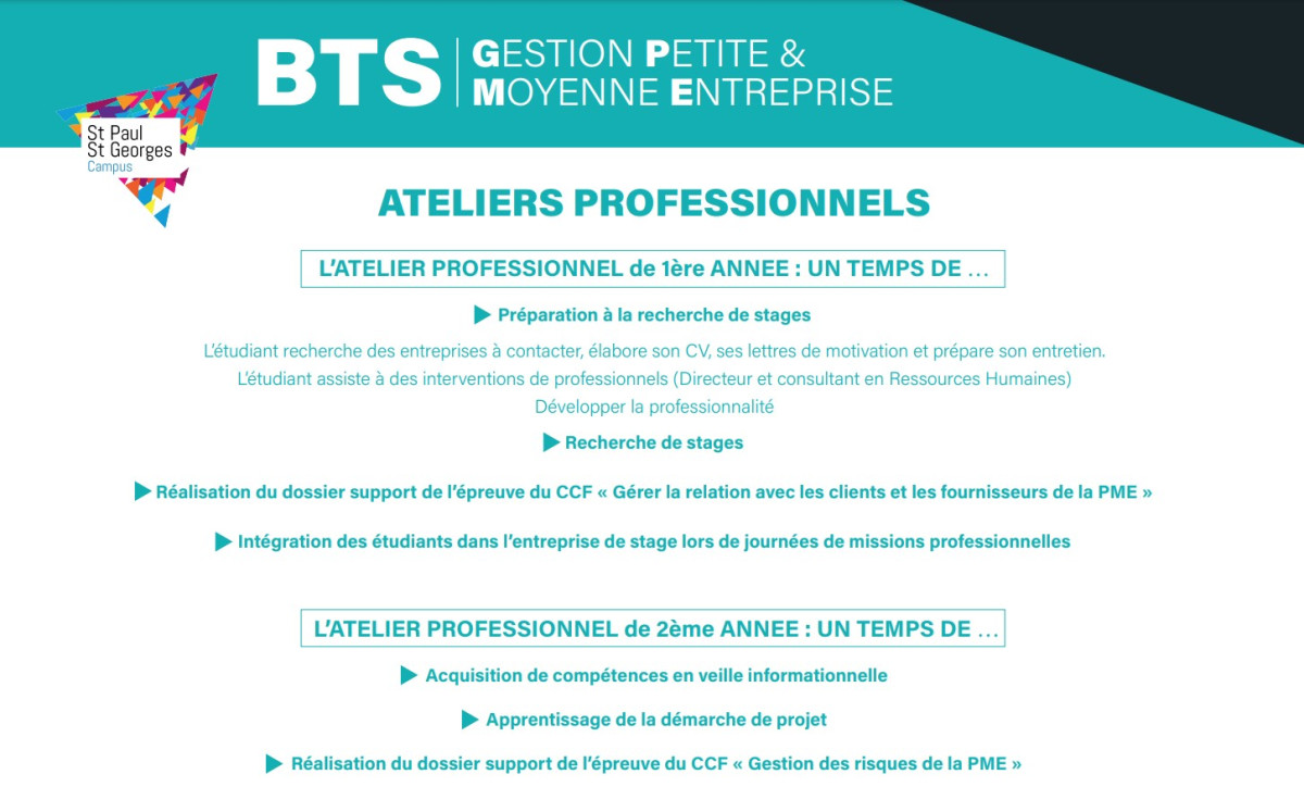 Un parcours bac + 3 est notamment assuré au lycée St Paul avec la possibilité de rejoindre les Bachelors proposés dans la continuité des BTS :