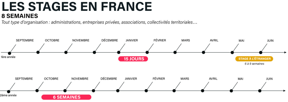 - 1ère année : 2 semaines (janvier) puis 6 à 9 semaines à l'étranger ou dans une entreprise à vocation internationale
