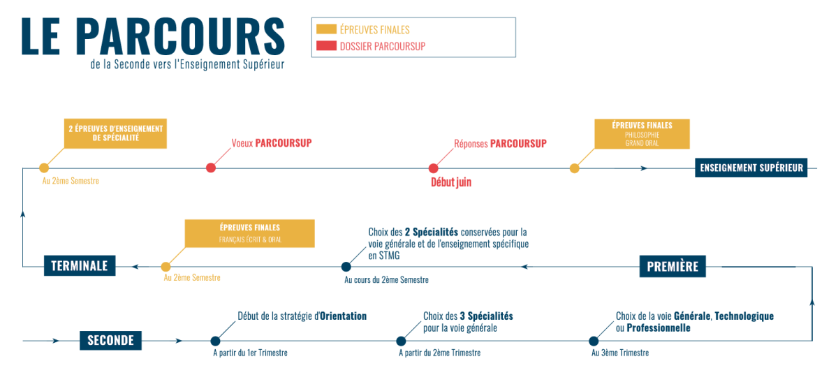 En terminale: épreuves des deux enseignements de spécialité (pendant le 2nd semestre) formulation des vœux sur Parcoursup (janvier à mars) réponses de Parcoursup (début juin) épreuves finales de philosophie et du Grand Oral