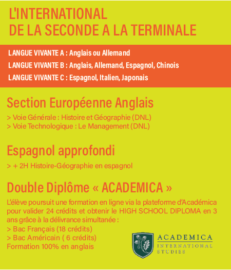 Double cursus dès la classe de seconde pour obtenir le High School Diploma américain en parallèle du bac français. Deux diplômes distincts homologués respectivement par le Département d’éducation de l’État de tutelle aux Usa et par l’Éducation nationale.