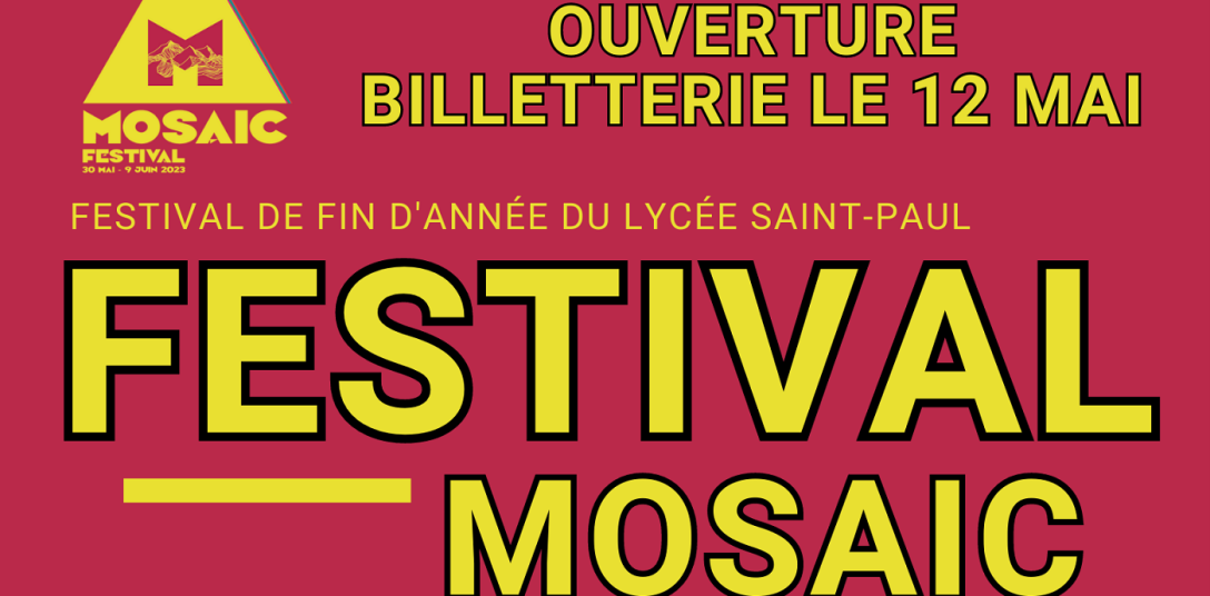 Du mardi 30 mai au vendredi 9 juin, le festival Mosaïc fête sa deuxième édition sur le site du lycée Saint-Paul. L'occasion de se divertir et terminer l'année scolaire en venant voir le travail réalisé par plusieurs dizaines de nos jeunes et leurs professeurs !