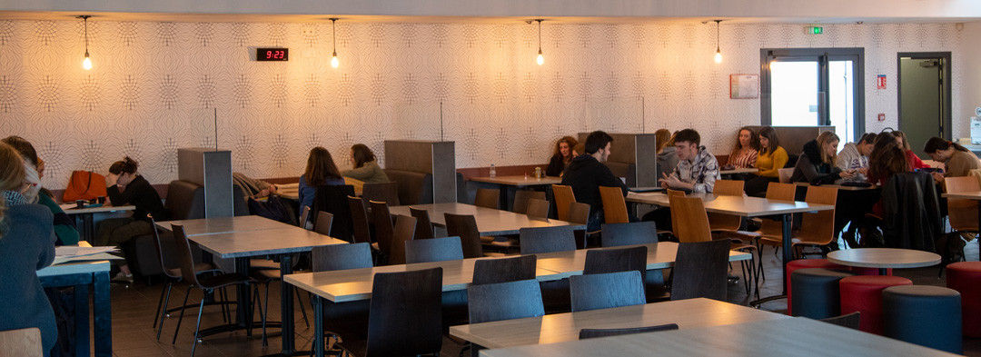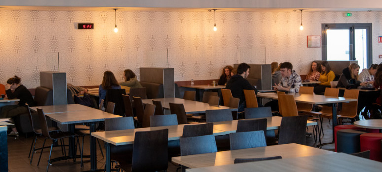 Située à côté de l'amphithéâtre, La Tribu est un lieu de vie à double objectif : foyer ou lieu d'études les matins et après-midi, elle devient une cafétéria sur les temps du midi.