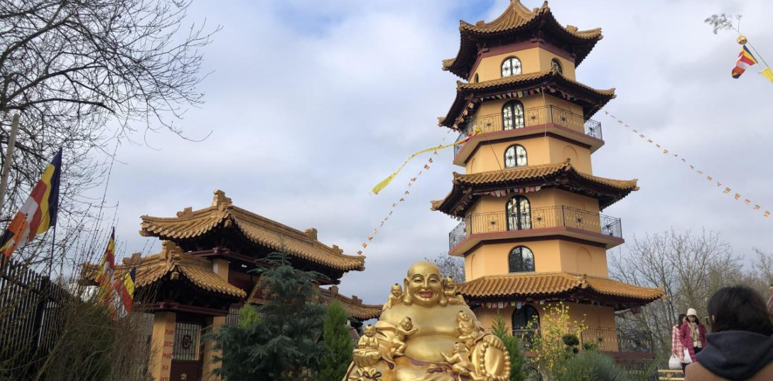 Il s’agit de la plus grande pagode (temple) bouddhiste d’Europe. Le bâtiment est imposant, à la couleur du soleil et décoré de banderoles à l’occasion du Nouvel an chinois. Le groupe est accueilli par un moine à la figure ronde et souriante. Il présente la pagode vietnamienne dans une courte visite guidée.